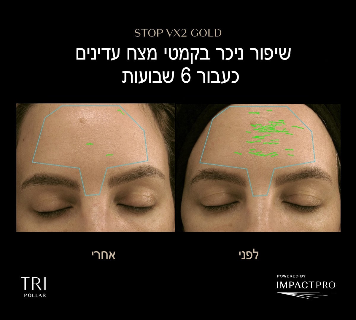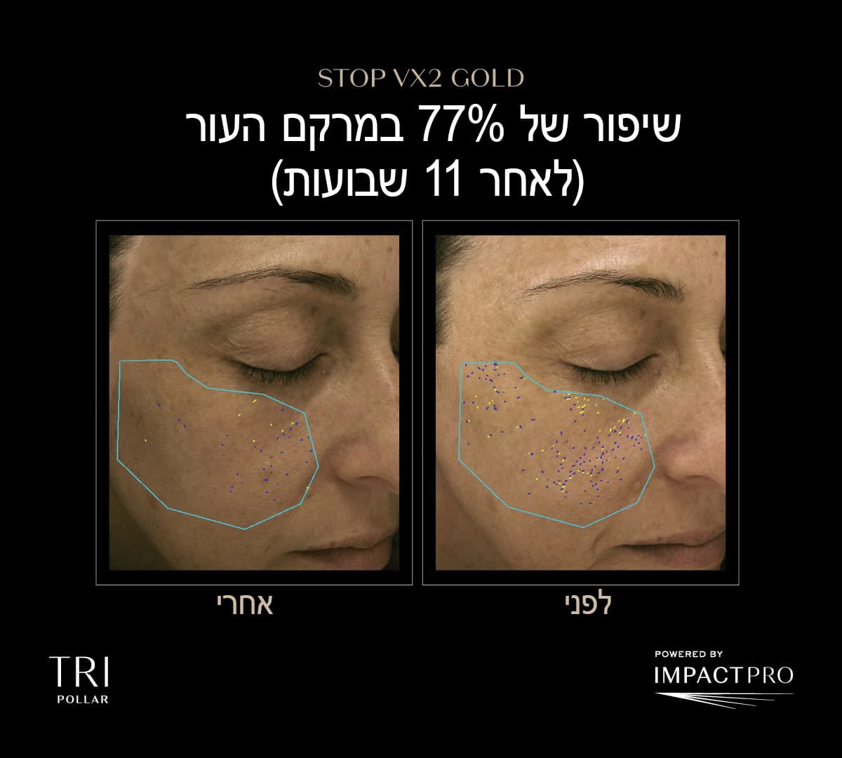 עם טכנולוגיית IMPACTPRO החדשנית, TRIPOLLAR STOP VX2 GOLD מציע את הטיפול העוצמתי והחכם ביותר, עם שילוב חסר תקדים של טכנולוגיות RF ו-DMA לתוצאות מקצועיות בהתאמה אישית.
